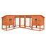 Kaninburet har et omfattende design med to huse og en meget stor løbegård med galvaniseret ståltråd, som gør det nemt at holde øje med dine kæledyr og som forhindrer ulykker. Det sikrer også din overvågning af kaninerne og giver dem mulighed for at få nok frisk luft. Kæledyrsburets stel er konstrueret af massivt fyrretræ, hvilket gør det stabilt og holdbart. Vippetaget er beklædt med vandafvisende stof og holder regnen ude. Husene har det perfekte soveområde. Derudover fører en skridsikker rampe fra jorden op til overetagen.
