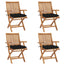 Dette møbelsæt er fremstillet af yderst slidstærkt teaktræ, som er ovntørret og derefter fintslebet, så det har en meget blød og glat overflade. Teaktræ er kendt for sin enestående styrke og vejrbestandighed, hvilket gør det langt mere velegnet til havemøbler i forhold til andre træsorter. Teaktræ er det perfekte valg, hvis du ønsker at købe langtidsholdbare møbler. Spisebordsstolene er vejrbestandige og lette at rengøre takket være den slebne overflade. De kan også foldes sammen for at spare plads, når de ikke er i brug. Derudover giver de medfølgende hynder ekstra komfort. Hver hynde er forsynet med 2 sæt snore for nem fastgørelse til stolen.