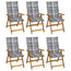 Foldestolen er lavet af massivt akacietræ, et tropisk hårdttræ, hvilket gør den stabil og holdbar. Den olielakerede overflade er nem at rengøre med en fugtig klud. Spisebordsstolen kan justeres i 5 stillinger, hvilket giver dig optimal siddekomfort. Den kan også foldes for at spare plads, når den ikke er i brug. Derudover giver de inkluderede hynder ekstra komfort, når du slapper af eller spiser. Hver hynde har to sæt snore på begge sider og en elastisk strop bag ryglænet til at fastgøre den på stolen.