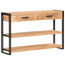 Dette opbevaringsskab er lavet af massivt akacietræ, et hårdttræ med tætte åremønstre. Dette smukt designede opbevaringsskab er stabilt, holdbart og iøjnefaldende. Det udsøgte håndværk og de smukke åremønstre gør hvert møbel unikt. Det stærke, pulverlakerede jernstel bidrager til robustheden. Den robuste top er ideel til fremvisning af pyntegenstande såsom billedrammer eller potteplanter. Konsolbordet har 2 skuffer og 2 hylder, så du kan holde bøger, magasiner og andre ting pænt organiseret og inden for rækkevidde.