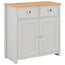 Skænken er fremstillet af konstrueret træ med melamin, så den er yderst stabil og holdbar. Den robuste top er ideel til at holde pyntegenstande såsom vaser eller potteplanter. Skabet med 2 skuffer og 2 låger giver rigelig med plads til at holde dine ting og sager pænt organiseret. Det kan også bruges i gangen som et konsolskab.